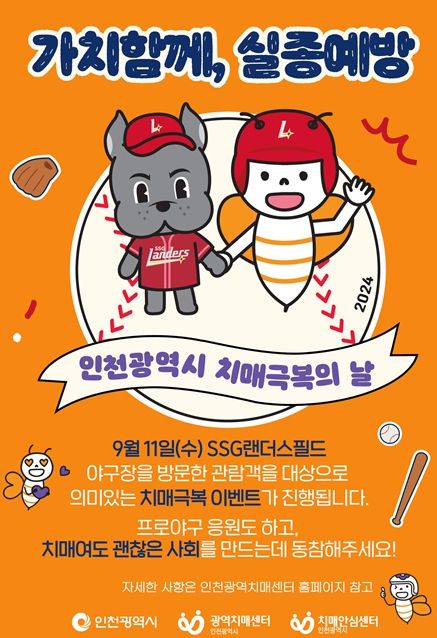 [파이낸셜경제=김영란 기자] 인천광역시와 인천광역치매센터는 ‘제17회 치매극복의 날(9월 21일)’을 맞아 프로야구단 SSG랜더스와 함께 ‘가치함께, 실종예방’을 주제로 9월 11일 ‘2024 인천광역시 치매극복의 날 기념행사’를 실시했다.