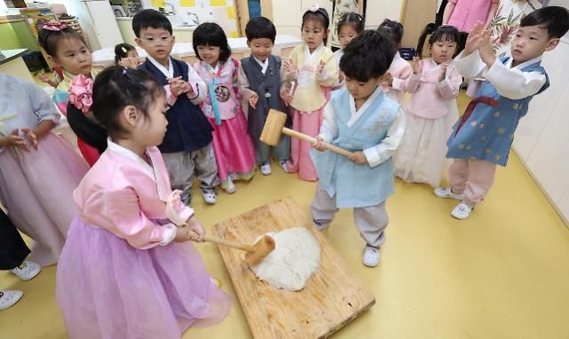 12日,位于大邱的一家幼儿园内,身穿传统韩服的小朋友们正在体验制作打糕。【图片提供 韩联社】