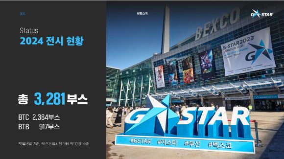 지스타 2024 참가 신청 현황은 9월 6일 기준, 총 3281부스(BTC관 2364부스, BTB 관 917부스)로 역대 최대 규모로 개최된 2023년 동일 시점 대비 약 101% 수준이다. 안정적인 전시 운영을 목적으로 작년 최초로 시도했던 현장 접수에 대한 높은 호응과 활발한 조기 신청 접수의 결과로 BTC 1전시장은 조기 신청 오픈 20분 만에 준비된 대형부스 구역이 100% 소진되기도 했다.