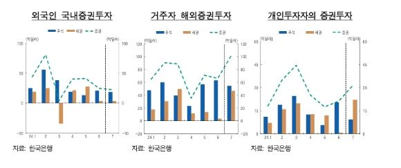 7월부터 양상이 달라졌다. 7월 중 외국인은 채권 비중을 줄였다. 거주자들은 해외증권투자를 더 늘렸다. 외국인의 국내 증권투자는 7월 중 22억4000만 달러 순 투자로 올해 상반기(월평균 39억2000만 달러)에 비해 규모가 많이 줄었다.