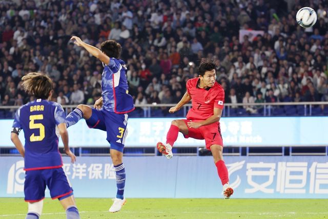 지난해 10월 7일 오후 중국 항저우 황룽 스포츠센터 스타디움에서 열린 2022 항저우 아시안게임 남자 축구 대한민국과 일본의 결승전에서 대한민국 정우영이 만회 골을 터뜨리고 있다. / 뉴스1