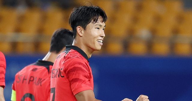 지난해 9월 19일 오후 중국 저장성 진화시 스포츠 센터 스타디움에서 열린 2022 항저우 아시안게임 남자 축구 E조 조별리그 1차전 대한민국과 쿠웨이트의 경기에서 정우영이 세 번째 골을 넣은 뒤 기뻐하고 있다. / 뉴스1