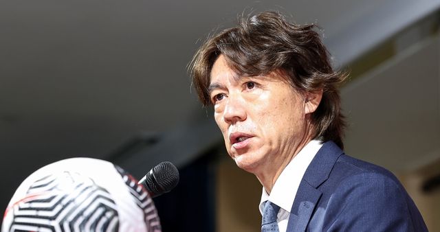 홍명보 대한민국 축구 국가대표팀 감독이 지난달 26일 오전 서울 종로구 축구회관에서 열린 '2026 북중미 월드컵 아시아지역 3차 예선 대표팀 소집 명단 발표 기자회견'에서 발언하고 있다. / 뉴스1