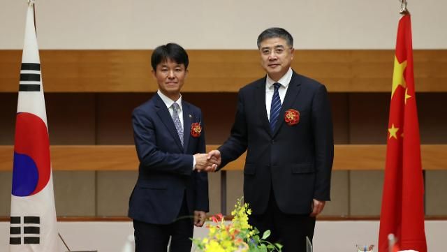 12日,第15次韩中日文化部长会议在日本京都举行。图为韩国文化体育观光部第一次官龙昊声(左)和中国文化和旅游部副部长张政在双边会谈后握手合影。【图片提供 韩联社】