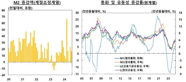 수익증권은 연준의 금리 인하 기대 강화 등 영향으로 단기 채권형 펀드를 중심으로 증가했다. 전월(9조2000억원)보다 증가폭이 확대됐다. 기타 통화성 상품은 외화예수금과 종합자산관리계좌(CMA)로 자금이 유입되며 전월(-2조8000억원) 대비 증가 전환했다. 정기예·적금의 경우 금리 고점 인식 및 은행 자금유치 노력 등으로 증가했지만, 전월(11조4000억원)보다 증가 폭이 줄었다.