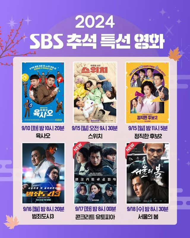 SBS는 지난 10일 공식 채널을 통해 올해 추석 특선 영화 목록을 발표했다. SBS는 명절 기간 동안 방송될 다양한 영화들을 소개하며 “한가위를 더 풍성하게 즐기세요. SBS와 함께 하세요”라고 시청을 독려했다.