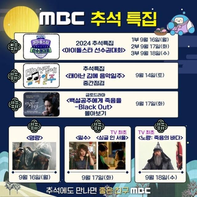 MBC의 경우 오는 16일 오후 10시에 '명량’, 오는 17일 오후 8시에는 ‘밀수’, 같은 날 오후 10시 20분 에는 ‘싱글 인 서울’이 방영될 예정이다. 마지막 연휴인 오는 18일 오후 8시에는 ‘노량: 죽음의 바다’ 가 방영될 예정이다.
