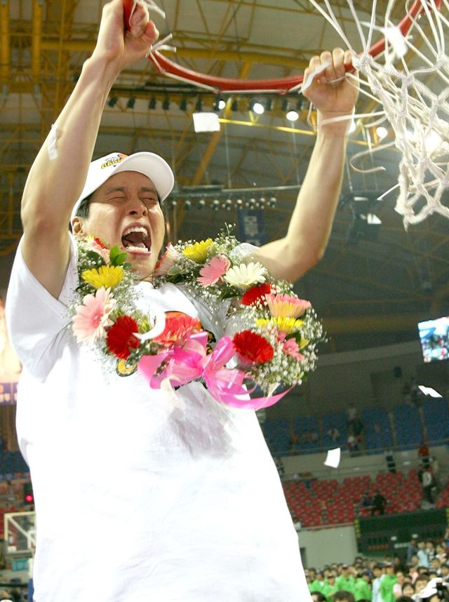 울산동천체육관에서 열린 프로농구 챔피언 결정전에서 프로 데뷔 후 10년 만에 우승을 차지한 우지원이 골 그물망을 자른 뒤 포효하고 있다. / 연합뉴스