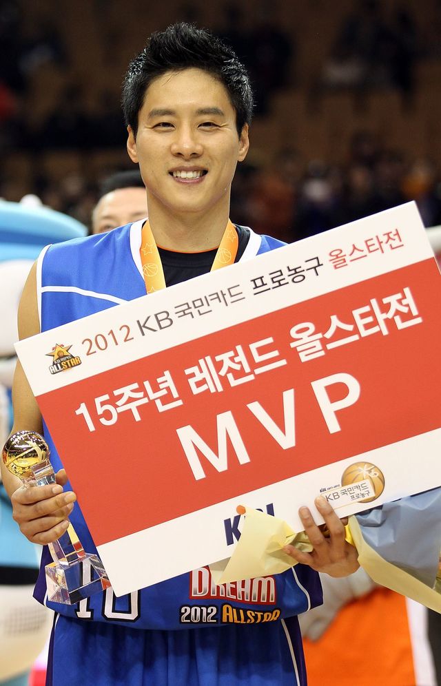 2012년 1월 28일 오후 서울 송파구 잠실실내체육관에서 열린 프로농구 레전드 올스타전에서 MVP를 수상한 우지원이 트로피를 들고 기념 촬영을 하고 있다. / 연합뉴스