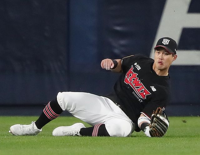 지난해 11월 2일 오후 경남 창원NC파크에서 열린 프로야구 '2023 신한은행 SOL KBO 포스트시즌' 플레이오프 3차전 kt 위즈와 NC 다이노스의 경기 4회말 2사 주자 없는 상황 kt 배정대가 NC 권희동의 타구를 잡아내고 있다. / 뉴스1