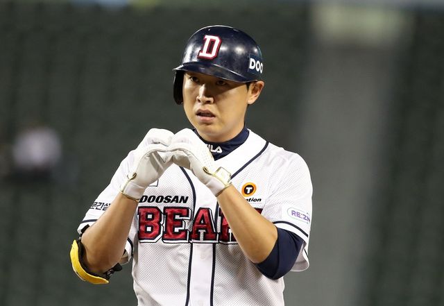 지난해 10월 12일 오후 서울 송파구 잠실야구장에서 열린 프로야구 '2023 신한은행 SOL KBO리그' 두산베어스와 NC다이노스의 경기에서 3회말 두산 공격 선두타자 정수빈이 안타를 치고 기뻐하고 있다. / 뉴스1