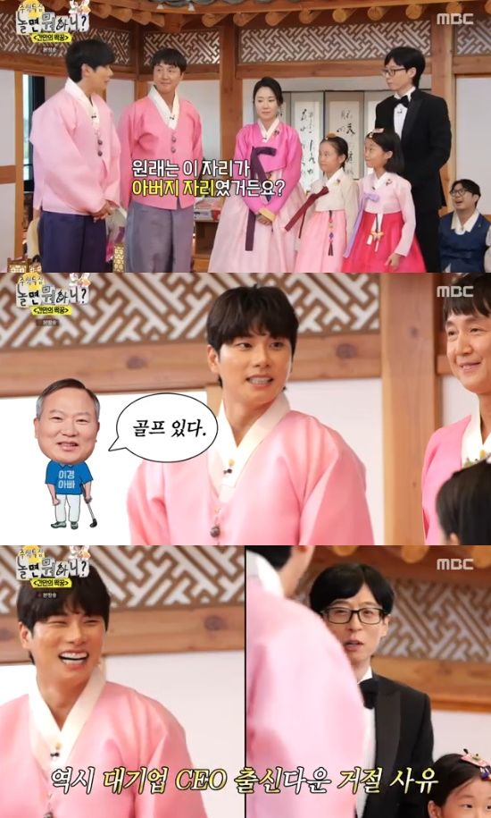 이어 그는 "원래 이 자리가 아버지 자리였다. 그런데 아버지가 아주 완강하게 '골프있다'라고 하시면서 출연을 거절하시더라"라며 비화를 전했다. 이에 유재석은 "역시 대기업 CEO다운 이유시다"라고 받아쳐 웃음을 자아냈다.