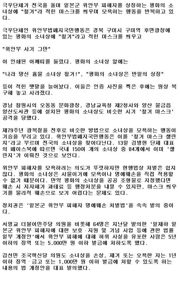 충북 음성 설성공원에서 극우단체인 위안부법폐지국민행동 구성원들이 평화의 소녀상에 '철거'라고 적힌 마스크를 씌운 모습.