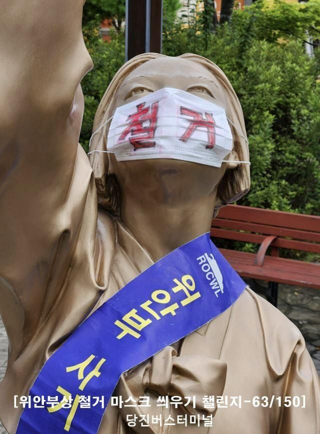 충남 당진 고속버스터미널에 위안부법폐지국민행동 구성원들이 평화의 소녀상에 '철거'라고 적힌 마스크를 씌운 모습. '63/150'이라는 숫자는 국내 150개의 평화의 소녀상 중 63개에 이런 행동을 했다는 의미로 추정된다.