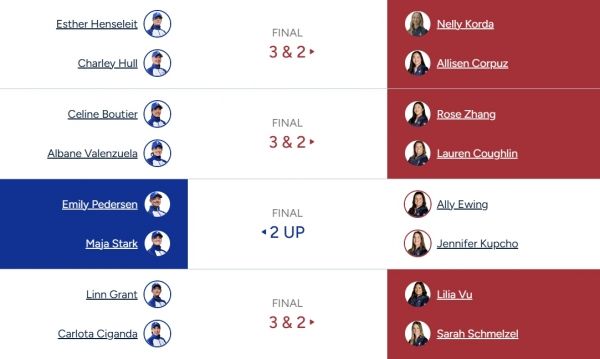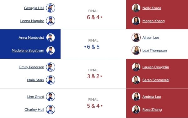 미국은 넬리 코다와 앨리슨 코퍼스가 유럽의 에밀리 페데르센과 카를로타 시간다조를 1홀차 이겼다.