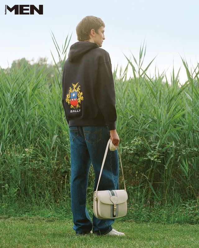 헤리티지 문장을 장식한 후디 스웨트셔츠와 데님 팬츠, 화이트스니커즈, 블루 스트라이프 패턴으로 포인트를 준 YK 메신저백