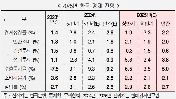한편 현대연은 올해 우리나라 경제성장률을 2.6%로 전망했다. 이는 석 달 전(2.7%)보다 0.1%포인트 하향 조정한 수준이다.