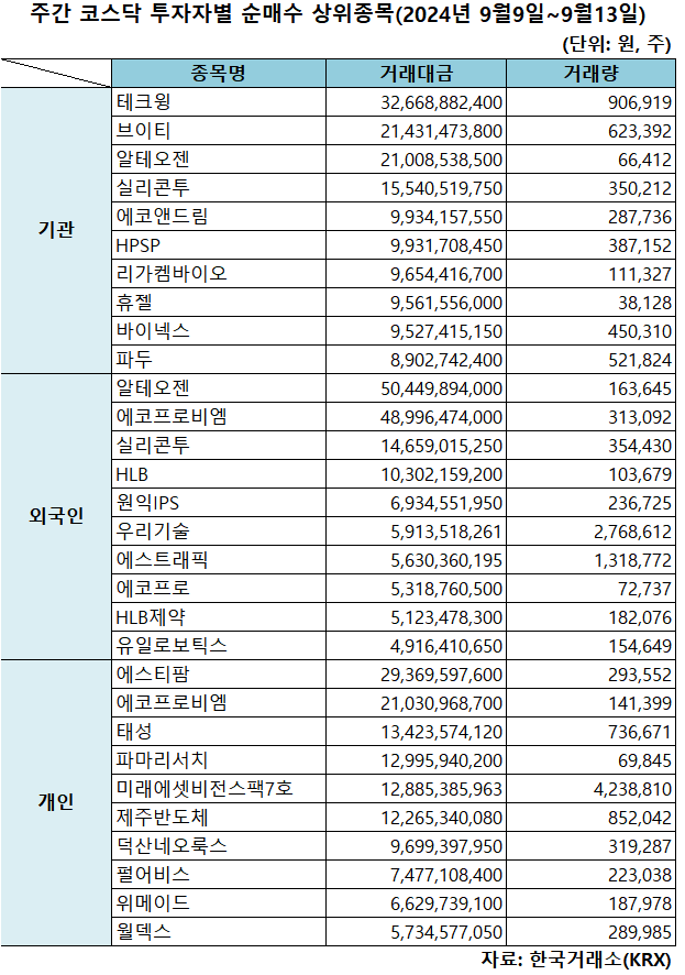 기관 '테크윙'·외인 '알테오젠'·개인 '에스티팜' 1위 [주간 코스닥 순매수- 9월9일~9월13일]