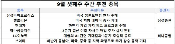 그는 "삼성바이오로직스가 미국 생물보안법 반사 수혜를 기대한다"고 전망했다. 셀트리온에 대해선 미국의 처방 데이터 증가를 이유로 호실적을 내다봤다. 신 연구원은 "현대차는 9월 중 밸류업 지수 발표 이후 패시브 자금 유입을 기대한다"고 설명했다.