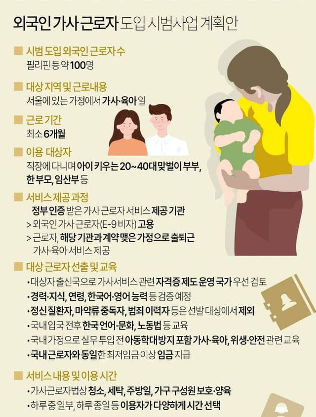 한편, 싱가포르나 홍콩 등 선진국에서는 이미 1970년부터 외국인 가사 관리사의 사용을 허용하고 있다. 이는 출산에 따라 여성들의 경력 단절을 줄이기 위한 목적으로 상당히 효율적인 제도로 평가된다.