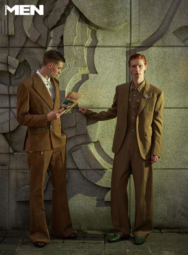 데니스 _ 브라운 재킷과 팬츠, 자수 장식 셔츠, LV 브로치 모두 Louis Vuitton,