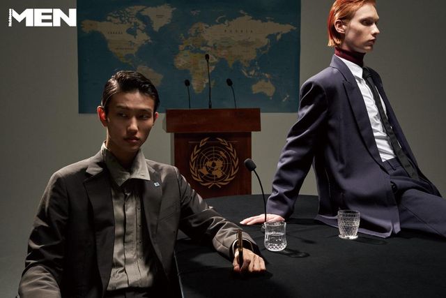 현준 _ 멜란지 그레이 재킷과 핑크 셔츠, 타이 모두 Prada.