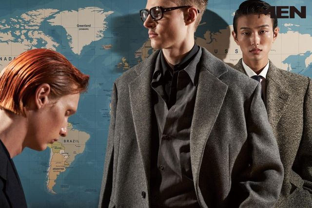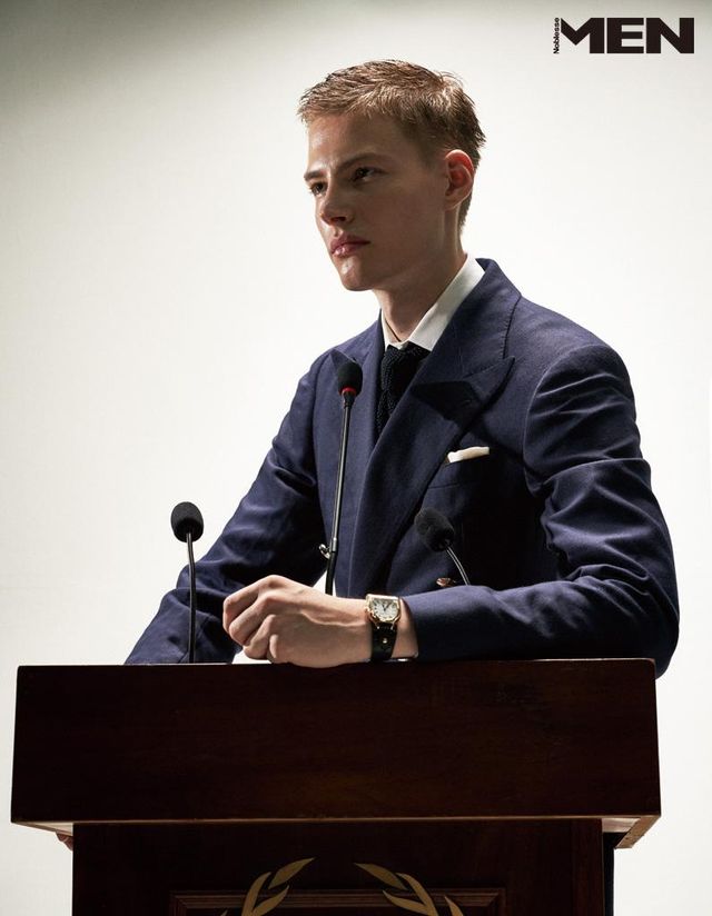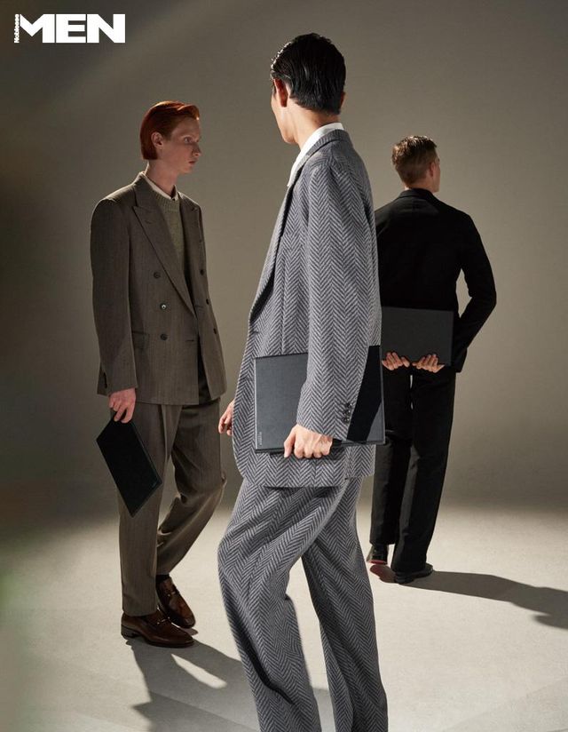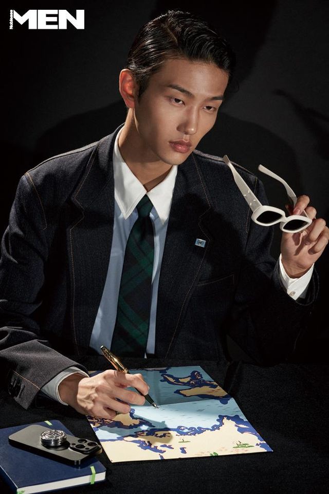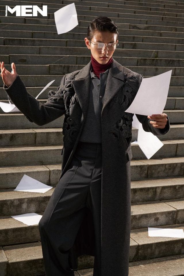 현준 _ 그레이 재킷과 와이드 칼라 셔츠 모두 Herme`s, 골드 코팅 캡 만년필 Montblanc.