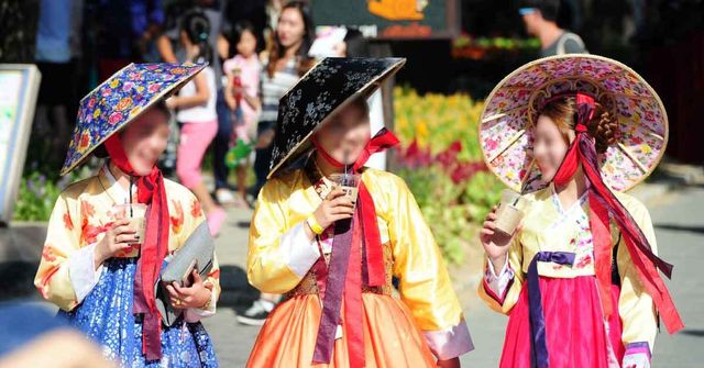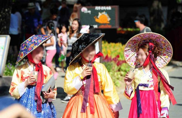 추석명절 연휴인 2015년 9월 28일 오후 전북 전주시 한옥마을에서 한복을 입은 관광객이 더위를 피해 음료를 마시며 걸어가고 있다. / 뉴스1