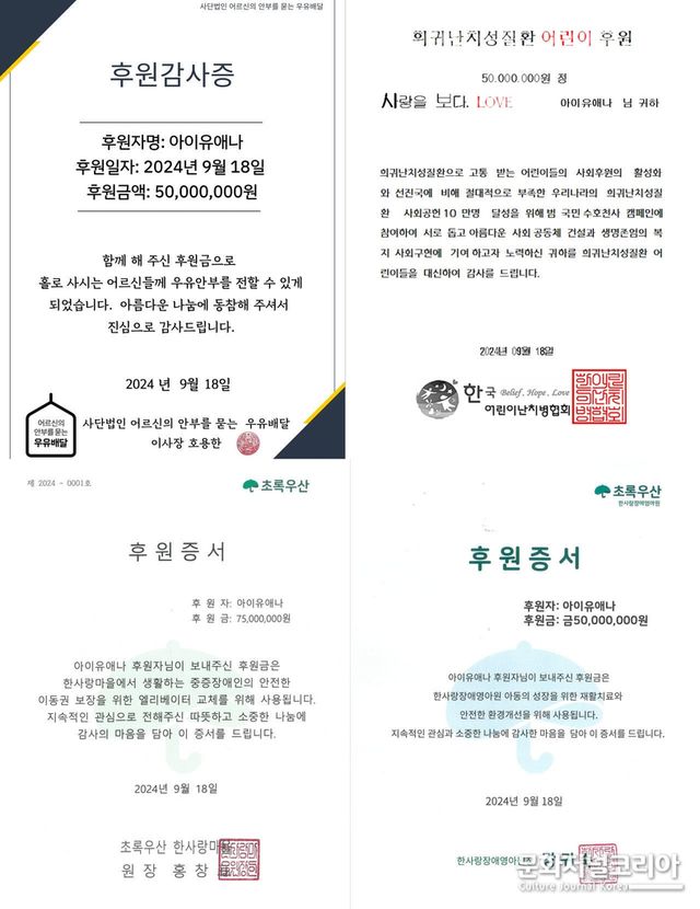 팬들에게 받은 사랑과 성원에 보답하고자 매년 데뷔 기념일마다 ‘아이유애나’의 이름으로 기부 활동을 이어오고 있는 아이유는 이번에도 어김없이 따스한 마음을 전했다. 이번 기부금은 희귀 난치성 질환을 앓고 있는 어린이들에게 치료비와 교육, 심리 상담, 의료용품 물품 지원, 홀로 계신 어르신의 건강을 위해 우유 지원 및 가정 방문 배달을 통해 찾아뵙고 고독사를 예방하는 활동 지원, 중증 장애인을 위한 시설 내 노후된 엘리베이터 교체 비용 지원, 영아원 내 편의시설 환경 조성 비용 지원 및 재활 치료비 비용 지원 등 도움이 필요한 곳에 다양하게 쓰일 예정이다.