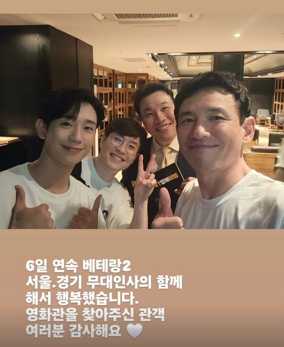 정해인은 18일 자신의 인스타그램에 류승완 감독, 황정민, 신승환과 함께 찍은 사진을 공개하며 "6일 연속 '베테랑2'. 서울, 경기 무대인사 함께해서 행복했습니다. 영화관을 찾아주신 관객 여러분 감사해요"라는 글과 함께 감사의 마음을 전하기도 했다.