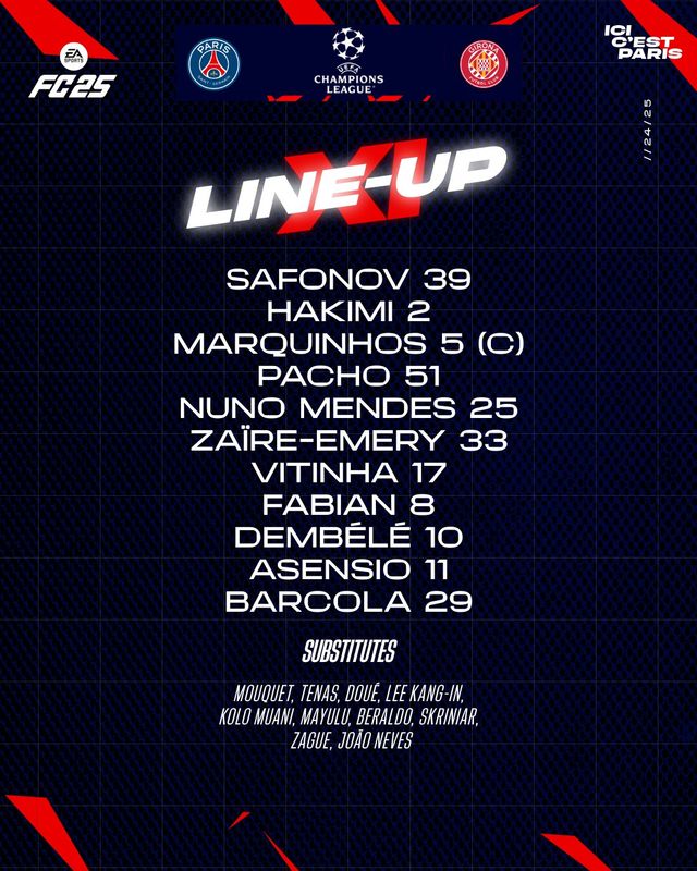 리그 페이즈 체제로 변화된 올 시즌 PSG는 첫 경기에서 지로나를 상대로 많은 기회를 만들지 못해 고전했다. 그러다 누노 멘데스의 결승 골이 후반 막판 터지면서 신승을 거뒀다.