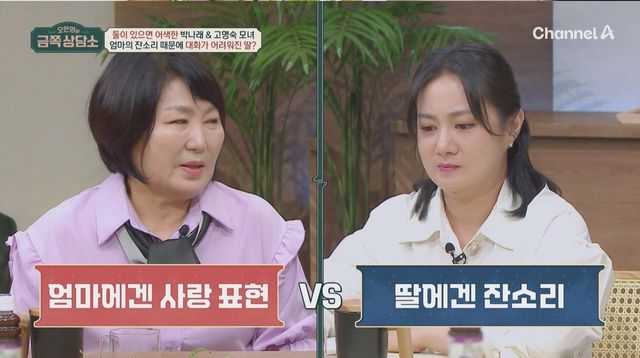 이날 박나래, 고명숙 모녀는 “서로 눈치를 보는 모녀, 둘이 있으면 어색해요”라는 반전 고민을 토로한다. “딸과는 살갑거나 애틋하지 않다”는 엄마 고명숙은 딸과 단둘이 여행을 간 적도 없고 둘이 가면 어색할 것 같다고 속마음을 밝히며 의외의 모녀 사이를 고백한다. 이어 딸에게 책을 선물하기 위해 서점을 방문한 엄마의 모습이 공개된다. 엄마 고명숙은 문득 딸의 안부가 궁금해 전화를 걸지만 둘의 통화는 약 20초 만에 끊겨버려 고민의 심각성을 더한다. 이에 고명숙은 “딸과 왜 이렇게 가깝지 않은지 잘 모르겠다”며 속상한 마음을 드러낸다.