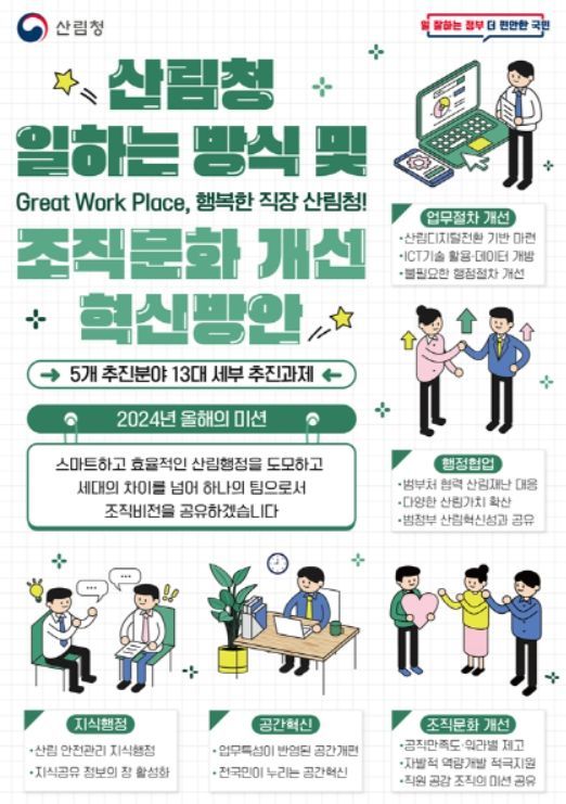 [와이뉴스] 산림청은 ‘일하고 싶은 산림청, 그레이트 워크 플레이스(Great Work Place)’로 나아가기 위해 일하는 방식과 조직 문화를 개선하는 혁신방안을 마련했다고 19일 밝혔다.