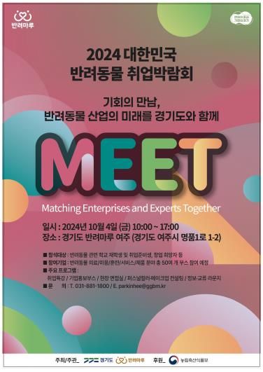 이강영 경기도 축산동물복지국장은 “경기도가 처음 시도하는 반려동물 취업박람회인 만큼 반려산업 분야 실질적 정보와 청년일자리 제공에 도움이 되길 바란다”며, “경기도 반려마루는 생명존중 가치 확산과 올바른 반려문화 정착뿐만 아니라 반려산업 발전에도 앞장서서 노력하겠다”고 말했다.