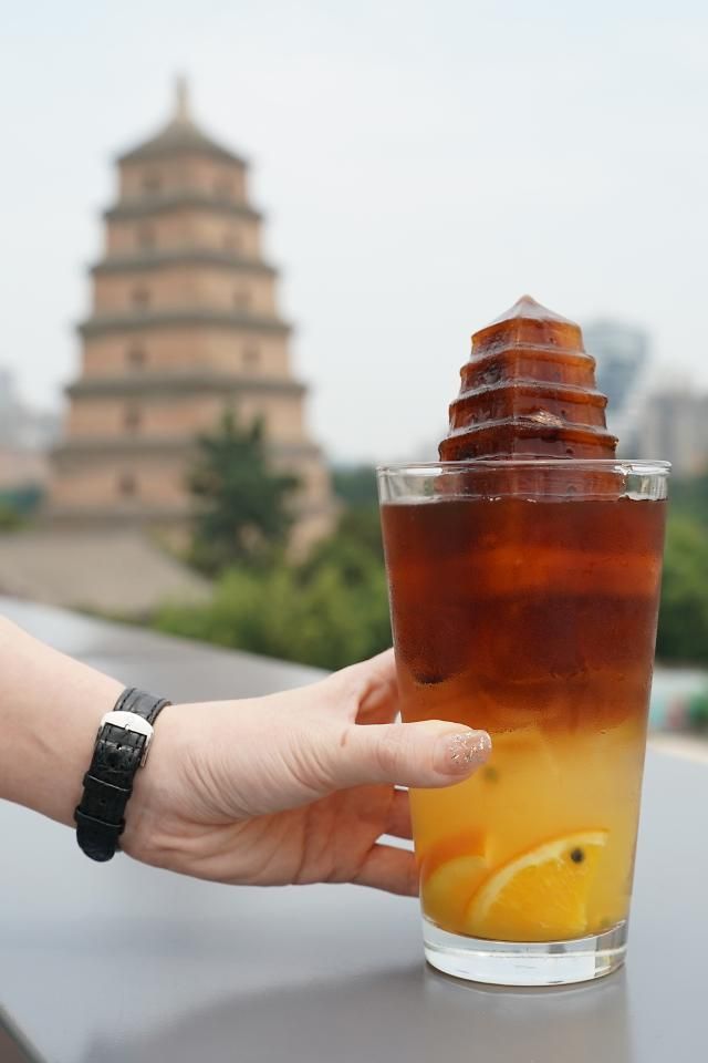 7月28日,在中国西安大雁塔周边一家咖啡馆内,游客展示一杯以大雁塔为主题的咖啡饮品。【图片来源 新华社】