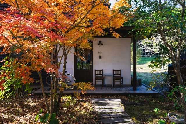 도로에서 현관으로 이어지는 길은 나무 터널을 지나도록 설계했습니다. 입구 앞에 심은 단풍나무가 사계절 내내 아름다운 풍경을 보여줍니다. 지금은 붉게 물들었어요. 제일 예쁜 시기예요.
