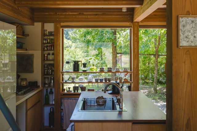 이곳으로 오면서 많은 살림살이들을 정리했고 답답한 수납장이 싫어 큰 창을 냈습니다. 주방에서도 자연과 연결되기를 바랐습니다. 식기에는 별로 관심이 없던 편이었는데 살아보니 여기서는 아름다운 식기, 예쁜 커피잔에 담아 마시고 싶어지더라고요. 그래서 다시 조금씩 수집해 나갔고 커피잔들을 올려두기 위해 창턱에 선반을 추가해 달았습니다. 창 너머 쏟아지는 참나무 숲의 햇살이 주방 공기를 더 찬란하게 가꿔줍니다.
