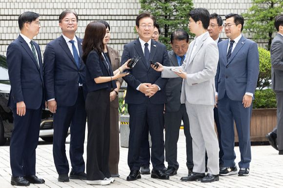 이날 서울중앙지법 앞에는 당 지도부도 참석해 이 대표에게 힘을 실었다. 박찬대 원내대표를 비롯해 전현희·김병주 최고위원, 이해식 당대표 비서실장, 이연희·정진욱 의원 등 인사가 이 대표를 맞이했다. 차량에서 내린 이 대표는 미소를 띤 채로 이들과 악수하는 등 줄곧 자신감을 드러냈다.