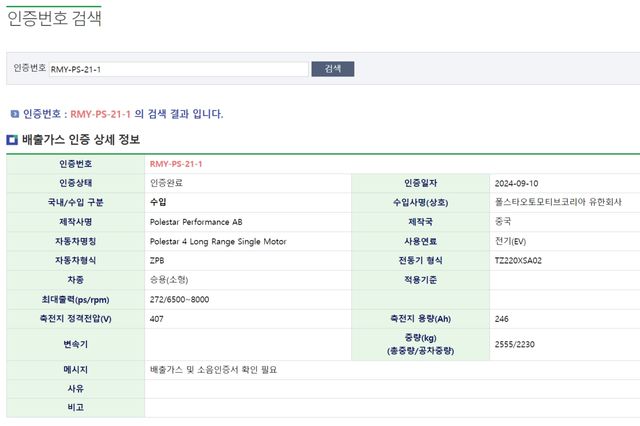 환경부는 지난 10일 폴스타 4 인증 내용을 자동차 배출가스 및 소음 인증시스템(KENCIS)에 등록했다. 4는 폴스타가 볼보에서 떨어져나와 독자적으로 만든 세 번째 차이자 두 번째 전기차로, 쿠페형 SUV 형태를 갖췄다. 8월에 국내 공개 행사를 치렀으며, 출고는 4분기에 이뤄질 전망이다.