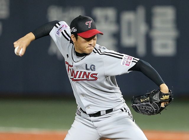 2014년 10월 28일 오후 서울 목동야구장에서 열린 프로야구 플레이오프 2차전 넥센 히어로즈 대 LG 트윈스 경기에서 7회말 LG 신정락이 역투하고 있다. / 연합뉴스