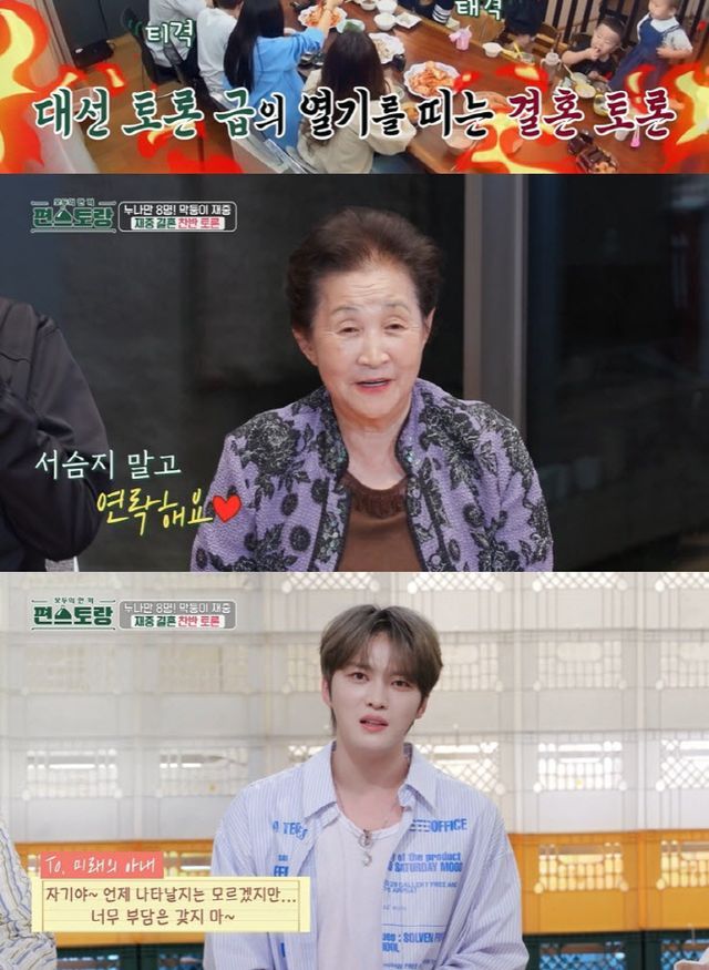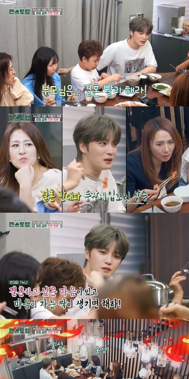 대가족의 즐거운 식사가 시작됐다. 함께 요리한 대용량 음식들을 먹으며 가족들 간 여러 대화가 오간 가운데, 막내아들 김재중의 결혼 토크가 시작됐다. 부모님은 김재중이 하루빨리 가정을 꾸리기 바란다고 속마음을 전했다. 김재중은 난감함을 감추지 못했는데, 반면 5명의 누나들이 ‘결혼은 해야 한다’와 ‘서둘러 억지로 할 필요 없다’로 나뉘어 팽팽한 찬반 토론을 이어갔다.