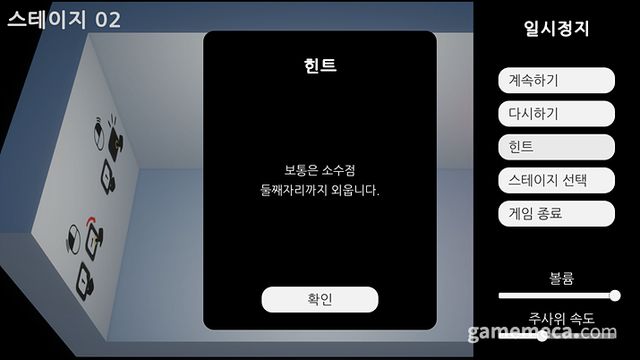 반면 다음 스테이지부터는 사정이 바뀐다. 주사위 눈금은 점이 아닌 1부터 6까지 아라비아 숫자며, 정면의 벽에는 거대한 원이 보인다. 이어 오른쪽에는 공간에는 소수점을 표현하는 듯한 점과 6개의 답을 입력하는 슬롯이 보인다. 플레이어는 화면 전체, 주사위 눈금, 주사위 움직임 등을 통해 질문을 유추한 뒤 답안을 채워야 한다.