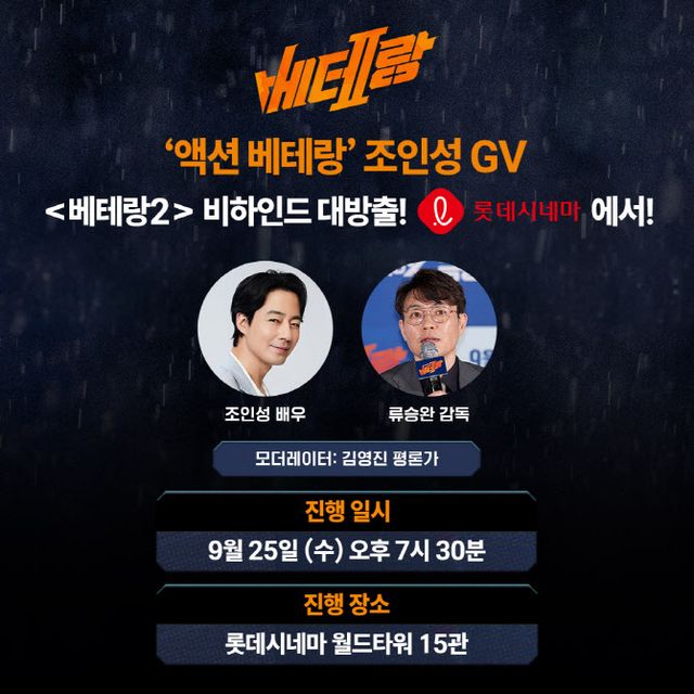 앞서 조인성은 ‘베테랑2’에 정해인이 합류하는 데에 도움을 준 미담이 알려져 온라인상 화제를 모으기도 했다. 매작품마다 기억에 남는 액션씬을 선사해온 배우 조인성이 본 ‘베테랑2’의 액션 연출과 배우들의 연기, 비하인드 스토리는 관객과의 대화를 통해 확인할 수 있다. 이번 행사는 롯데시네마 앱에서 예매 가능하다.