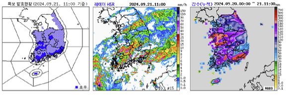 21일 11시 현재 강원영동, 충청권, 남부지방을 중심으로 호우특보가 발효 중이다. 남부지방을 중심으로 시간당 30~50mm(경남 김해는 시간당 60mm 내외)의 매우 강한 비가 내리고 있다. 그 밖의 지역에서는 시간당 10~30mm의 강한 비가 내리는 곳이 있겠다.