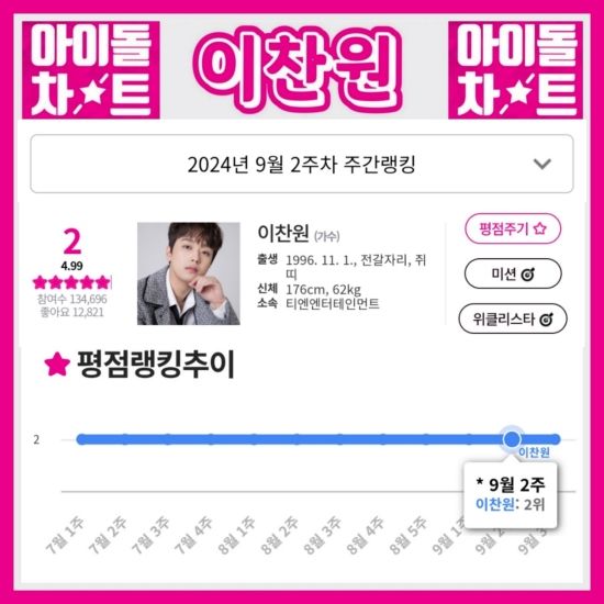 (엑스포츠뉴스 이정범 기자) '찬또배기' 이찬원이 9월 2주 차 아이돌차트 평점 랭킹 2위에 올랐다.