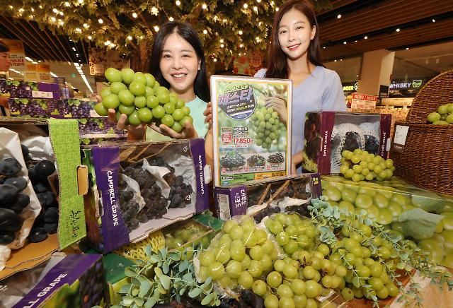 首尔一家超市中出售的“阳光玫瑰”。【图片提供 韩联社】