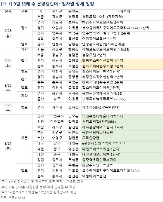 [아이뉴스24 이수현 기자] 9월 넷째 주에는 전국에서 2개 단지 총 2819가구(일반분양 1492가구)가 분양 예정이다.