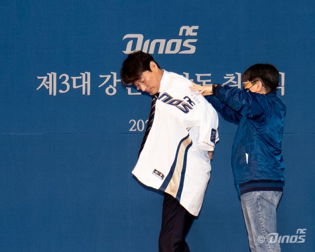 프로야구 현장과 프런트의 소통 과정에 오해가 생기고 마음이 상할 때가 있습니다. 그렇다면 양쪽의 말에서 쟁점과 감정을 분리해야 합니다. 소통에도 통역이 필요합니다. NC는 20일 강인권 감독을 경질했습니다. 사진은 2022년 11월 감독 취임식에서 임선남 단장(오른쪽)이 강 감독에게 유니폼을 입혀주는 장면. 사진=NC 다이노스 제공