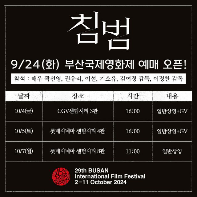 제29회 부산국제영화제 한국영화의 오늘-파노라마 섹션에 공식 초청되어 화제가 되고 있는 ‘침범’은 부산국제영화제 첫 상영 이후 2025년 전국 극장 개봉 예정이다.