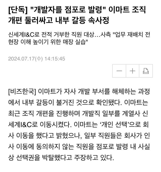 신세계I&C로 이동에 동의하지 않는 직원들을 점포 진열업무에 배치